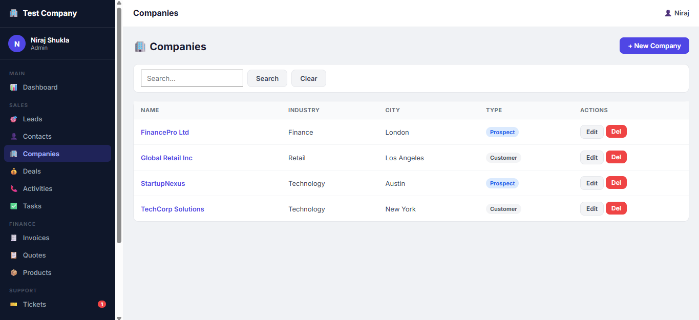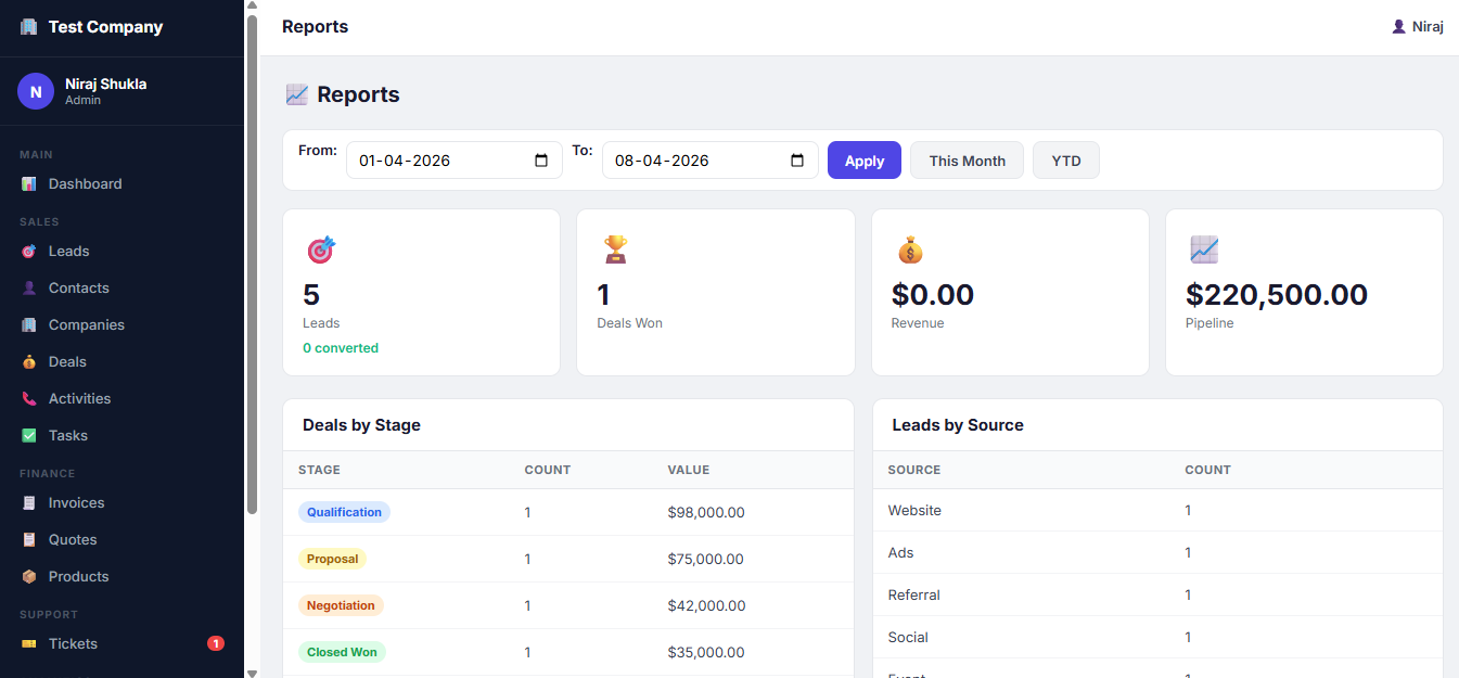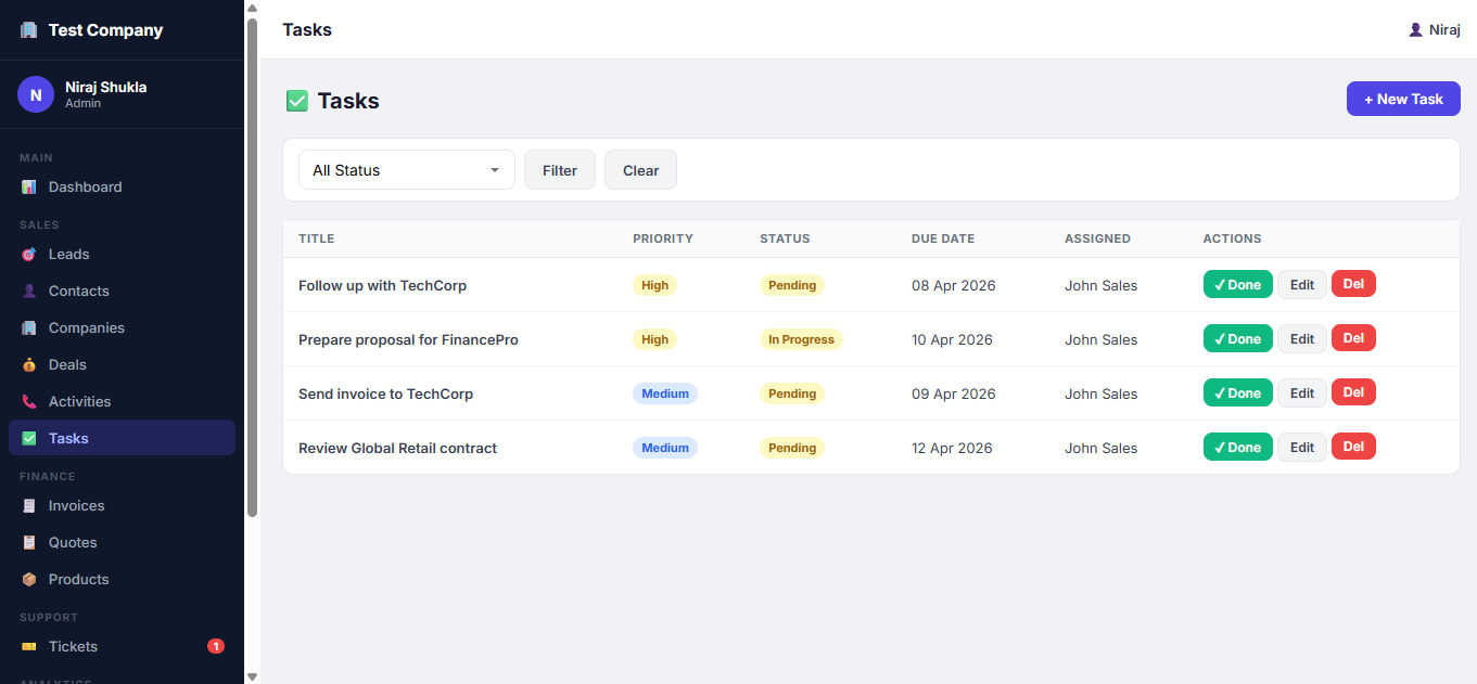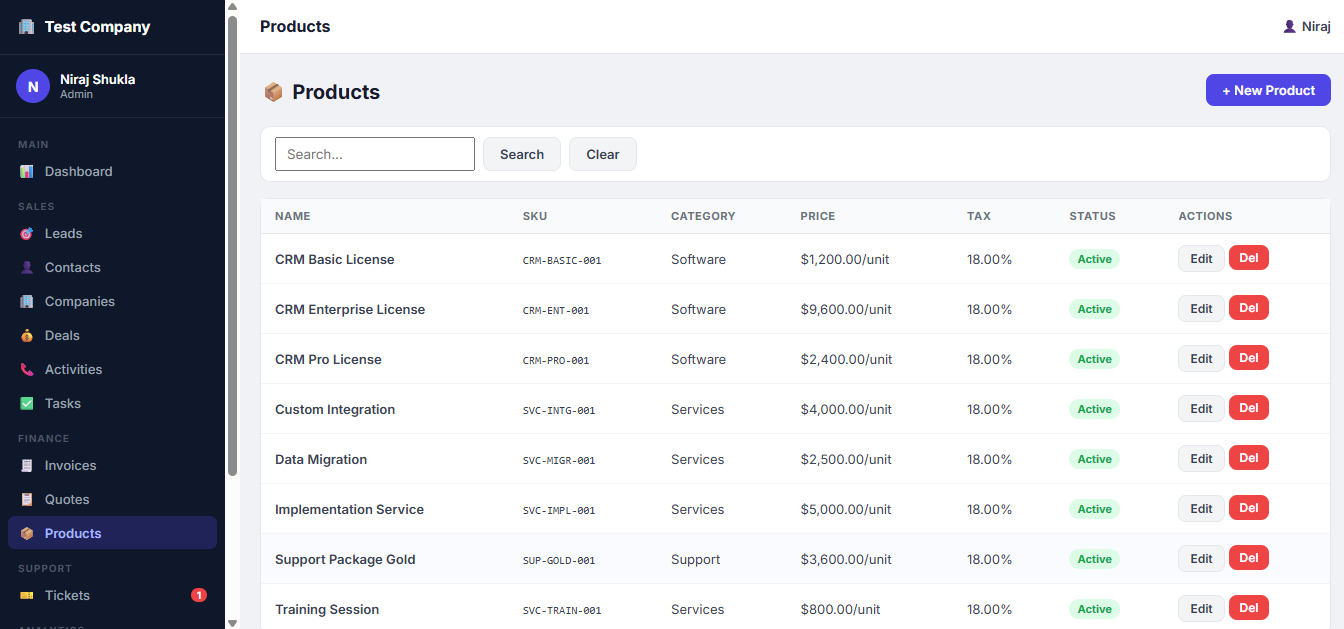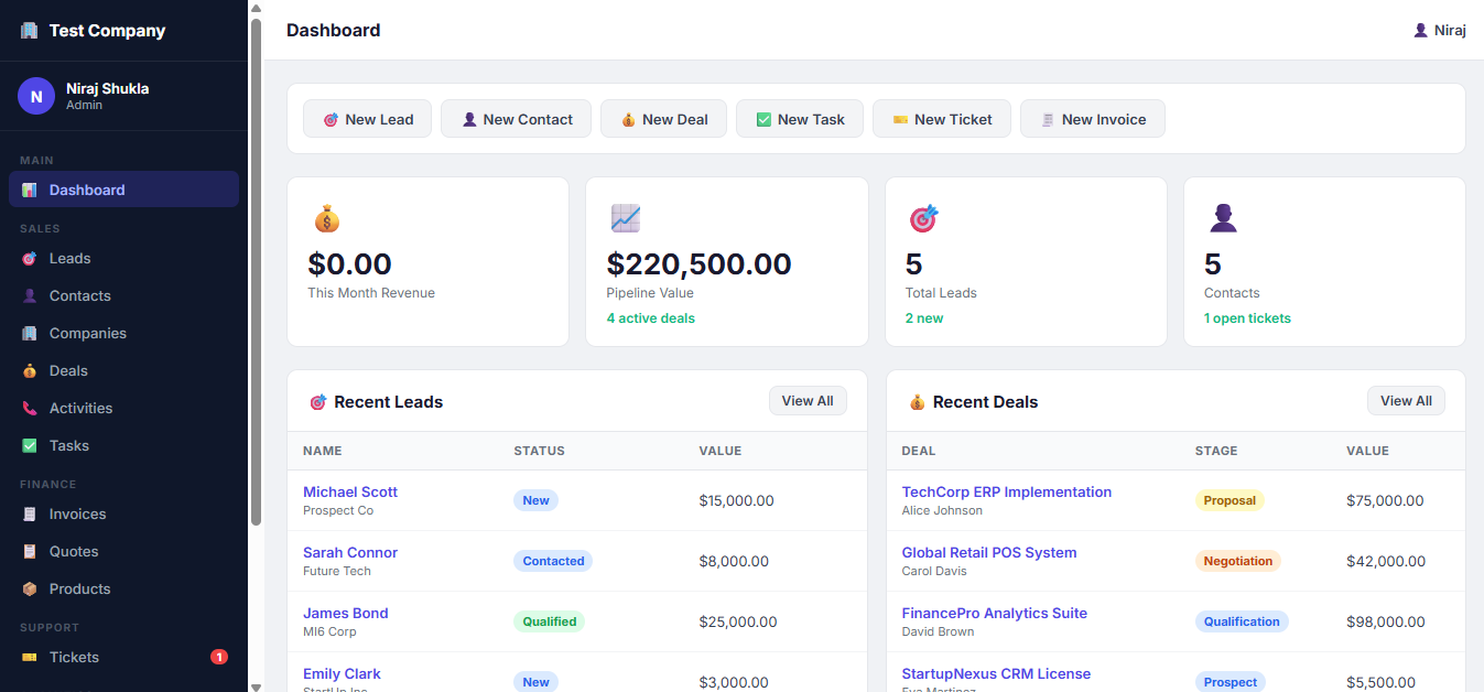 A powerful and user-friendly CRM (Customer Relationship Management) Portal designed to streamline your entire business workflow—from lead generation to final invoicing. This all-in-one platform helps businesses efficiently manage customers, sales pipelines, tasks, and financial documents with ease.